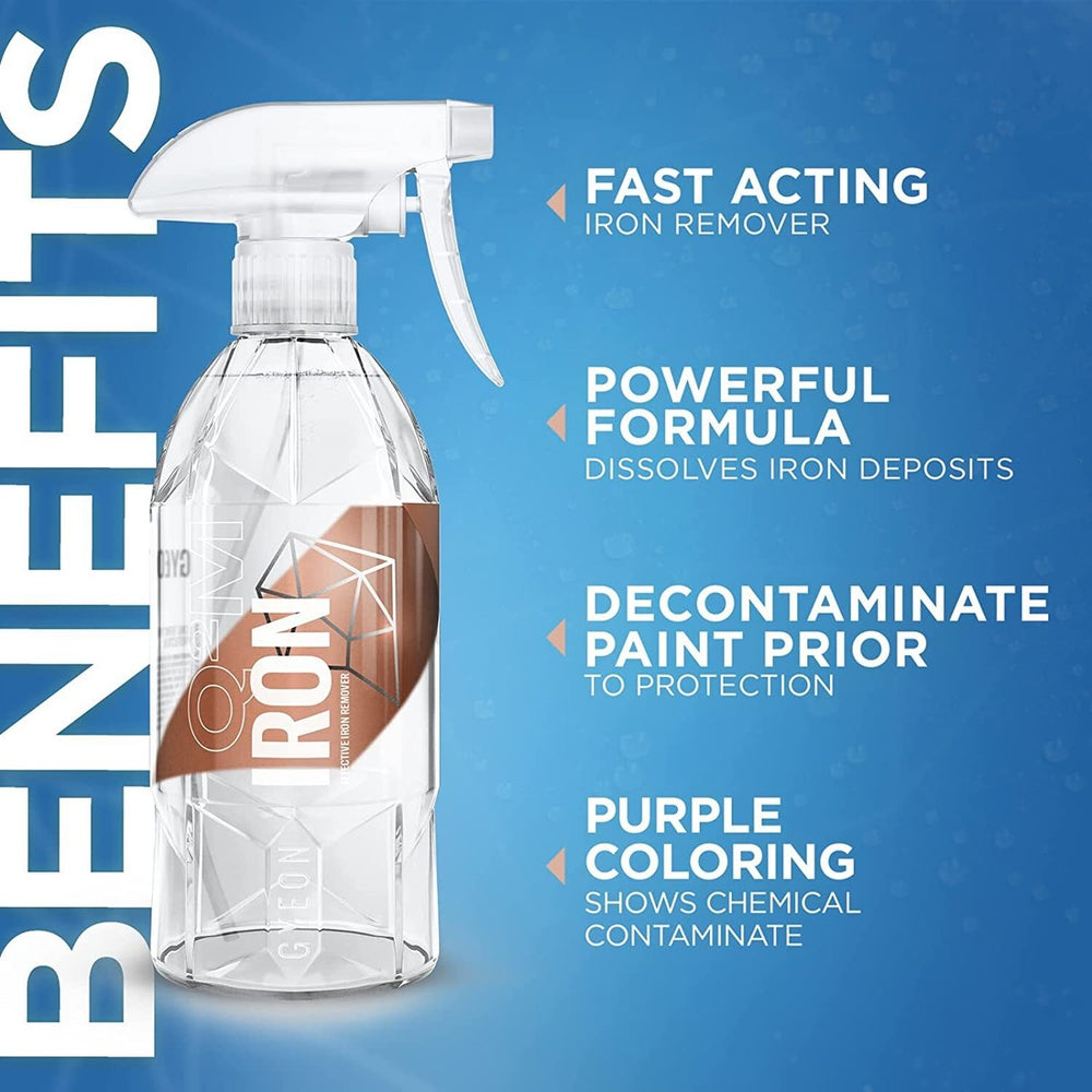Gyeon Q²M Iron is a chemical decontamination product designed as a safe way to remove embedded iron particles from vehicle paint and to help treat wheels with embedded brake dust. These contaminants can be invisible to the naked eye but remain bonded to the surface.