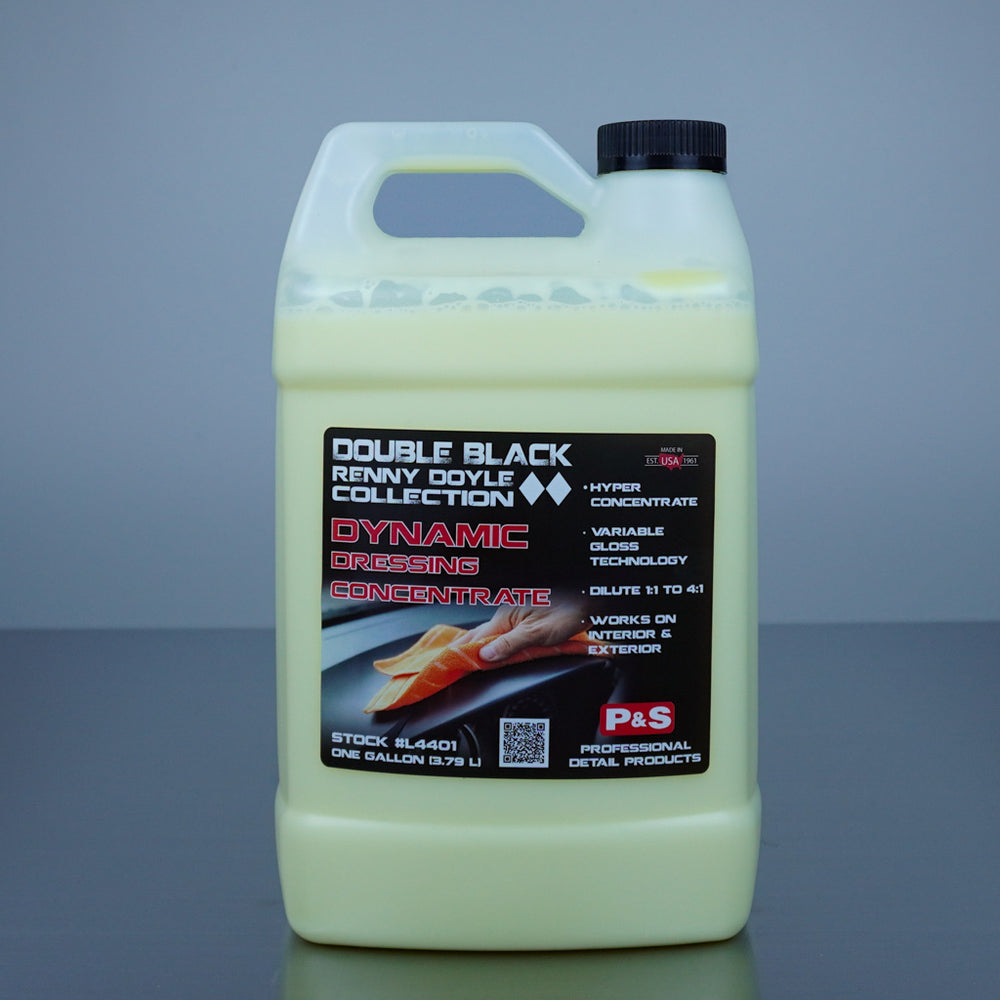 Dynamic Dressing is a perfect product for all dressing applications. Since Dynamic is so concentrated, it may be used with varying dilution ratios depending on desired performance. Dynamic diluted with water anywhere from 1:1 for a high gloss or 4:1 for a natural finish. One product for multiple applications makes product management easier. Dynamic Dressing may be used on tires, exterior trim, engine compartments, undercarriage, interior trim, leather and vinyl.Â
