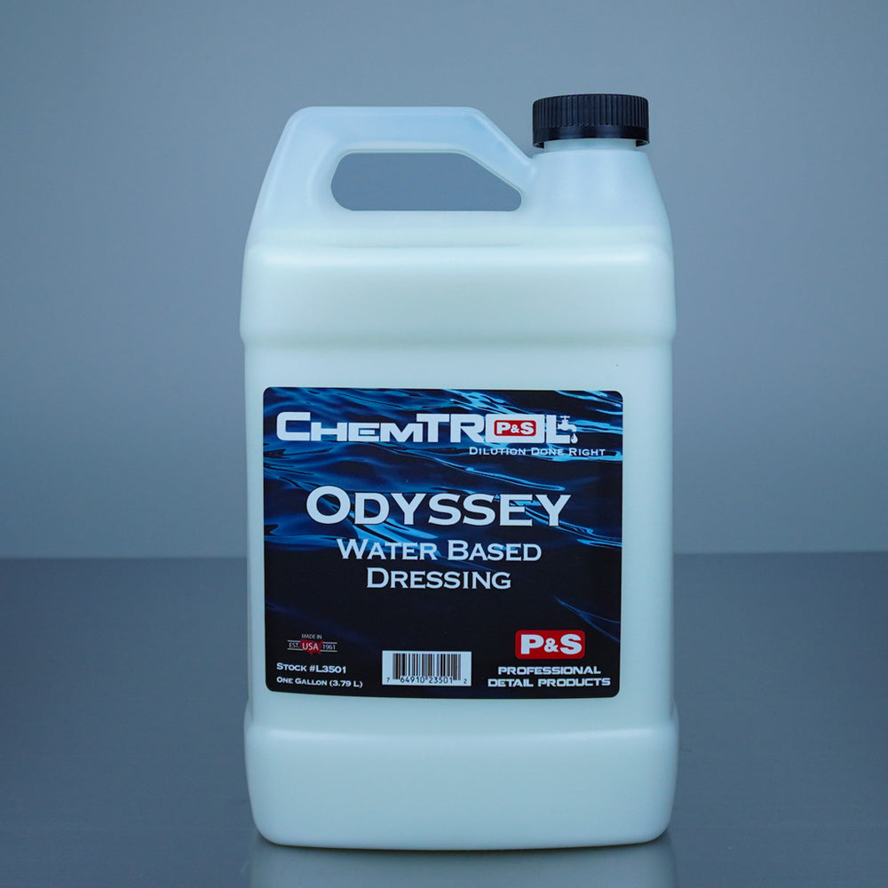 Conditions, softens, preserves and protects all leather, vinyl or rubber surfaces. Odyssey Water Based Dressing is a hybrid emulsion gel high quality, silicone dressing that may be used for all dressing applications. Odyssey leaves a beautiful natural shine on both the interior and exterior. Odyssey Water Based Dressing is ready to use product. Odyssey is not dilutable through the fill stations but may be diluted 1:1 up to 4:1 if desired.