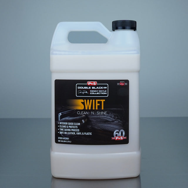 SWIFT Clean & Shine is the All-In-One interior quick detail clean and shine product. SWIFT quickly and effectively removes dirt and grime from leather, vinyl and plastic. Once cleaned SWIFT leaves behind a conditioned dressed appearance. The pleasant fragrance of SWIFT makes using this product a great experience for the derailer and consumer.