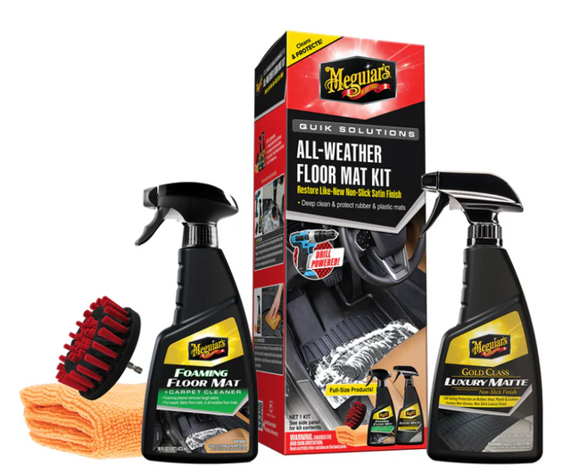 Keep your interior looking like new with this complete car detailing kit for rubber and plastic floor mats. The included Foaming Floor Mat & Carpet Cleaner quickly lifts dirt, grease, and grime from all-weather mats and floor liners, leaving them fresh and restored. Follow up with the Gold Class Luxury Matte to provide lasting UV protection while maintaining a clean, non-greasy finish on rubber, vinyl, and plastic mats. For deeper cleaning, use the included drill brush attachment to power through stubborn buildup and save time on tough jobs. A premium microfiber towel is also included to wipe away residue and leave your floor mats spotless and looking like new. This all-in-one car cleaning kit is the perfect kit for anyone looking to clean, maintain, and protect their car mats and floor liners with the professional results you’d expect from Meguiar’s. Meguiar's family of Quik Solutions kits provides everything needed, including a drill-based quick-connect accessory. These kits make it easy to quickly address the most common challenges users face when caring for their vehicles. Choose our Leather Care Kit, All Weather Floor Mat Kit, Carpet & Cloth Cleaning Kit, and Scratch Eraser Kit for easy cleaning solutions.