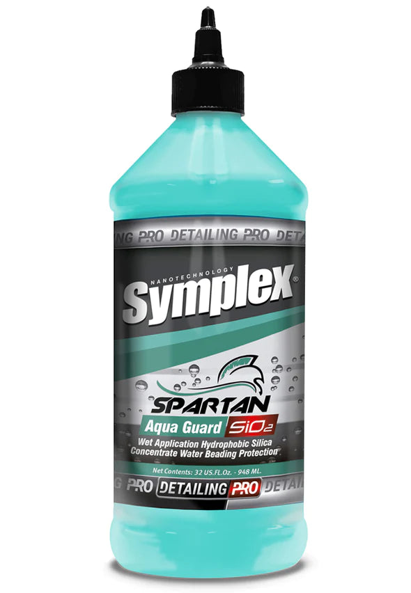 Symplex® Spartan Aqua Guard Si02 Silica Wet Application Water Beading Surface Protection. Contains a high concentration blend of silica dioxide and the latest polymers to create a Water Beading Wet Surface Protection. Spartan Aqua Guard SiO2 is easy to use and within minutes will impart a super slick hydrophobic layer that shines like a wax and protects your paint.